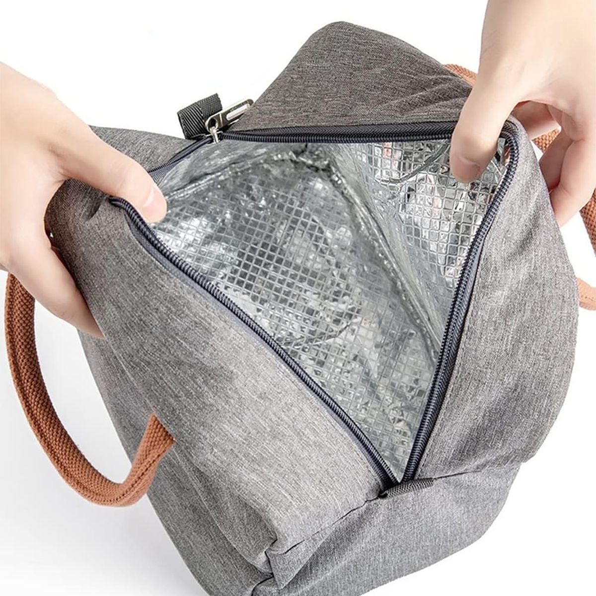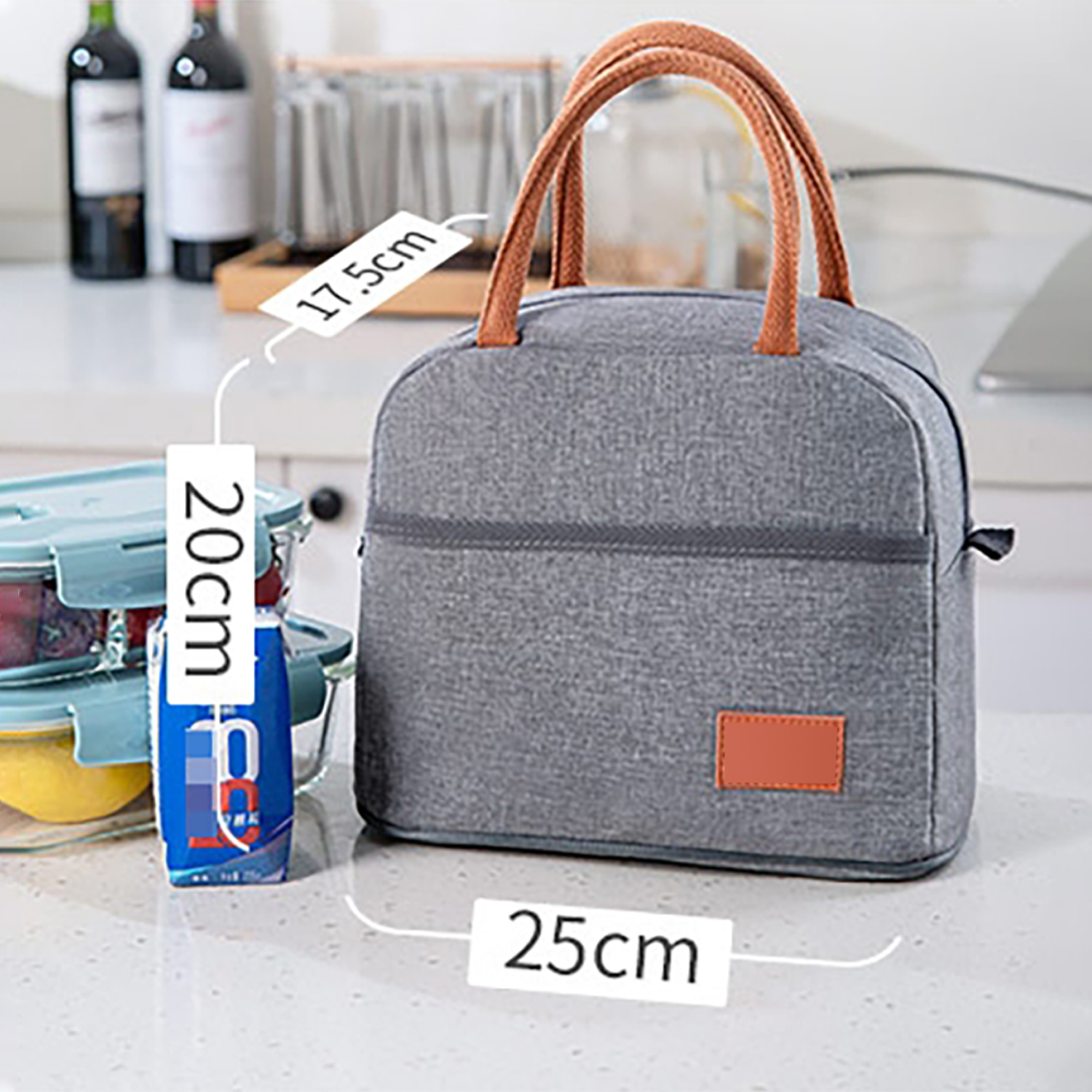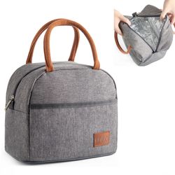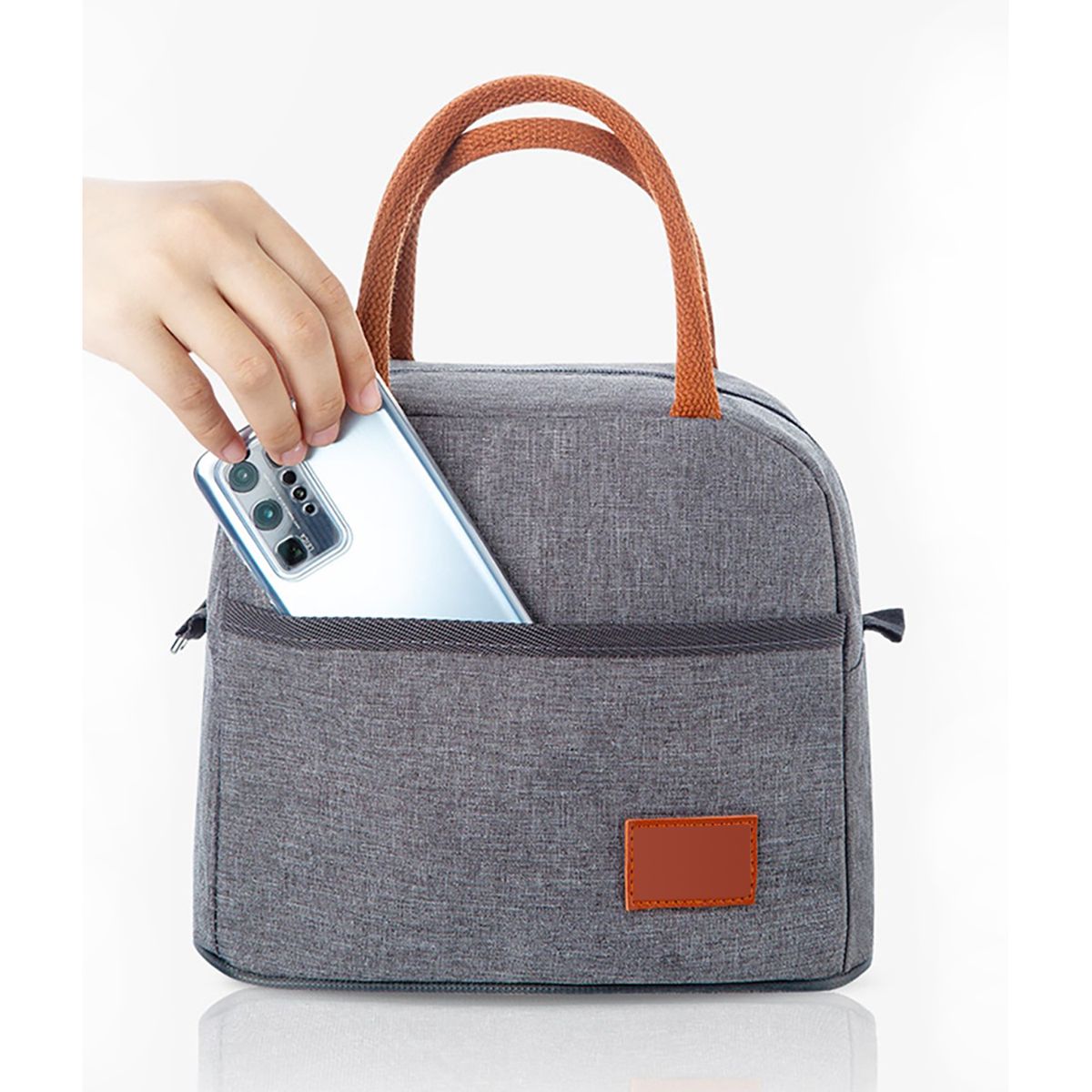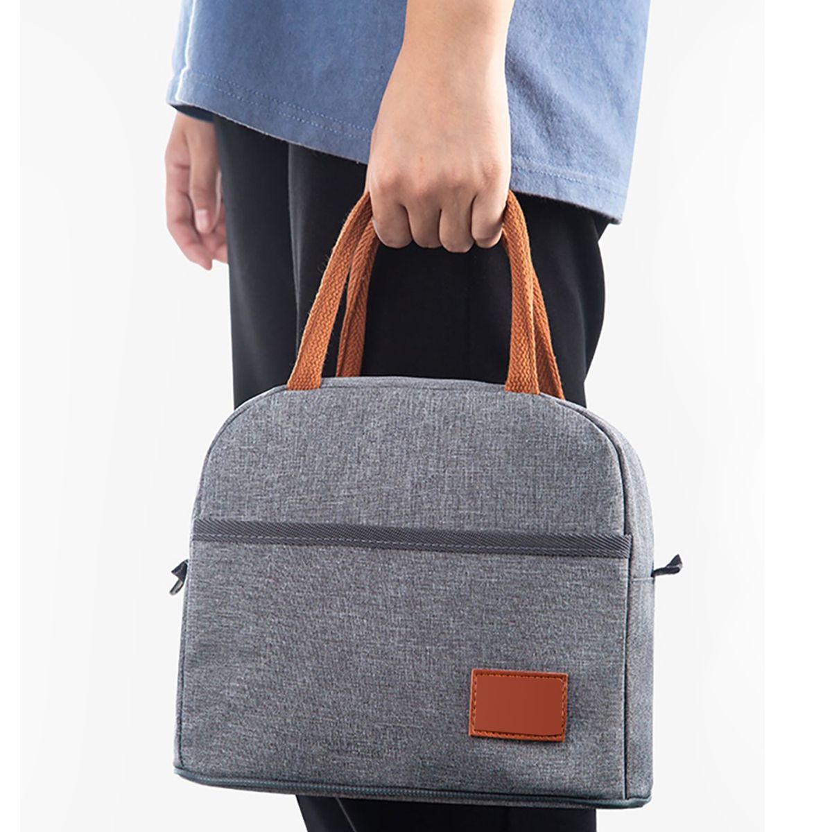 This compact and stylish lunch bag is perfect for keeping your meals fresh throughout the day. Made from durable grey fabric with brown handles, it features an insulated interior that maintains the temperature of your food. The spacious main compartment provides ample storage, while the front pocket offers additional space for smaller items. The bag is easy to carry with its sturdy handles, and the secure zipper closure ensures that everything stays in place. Ideal for work, school, or travel, this lunch bag combines practicality with modern design.