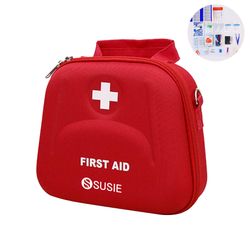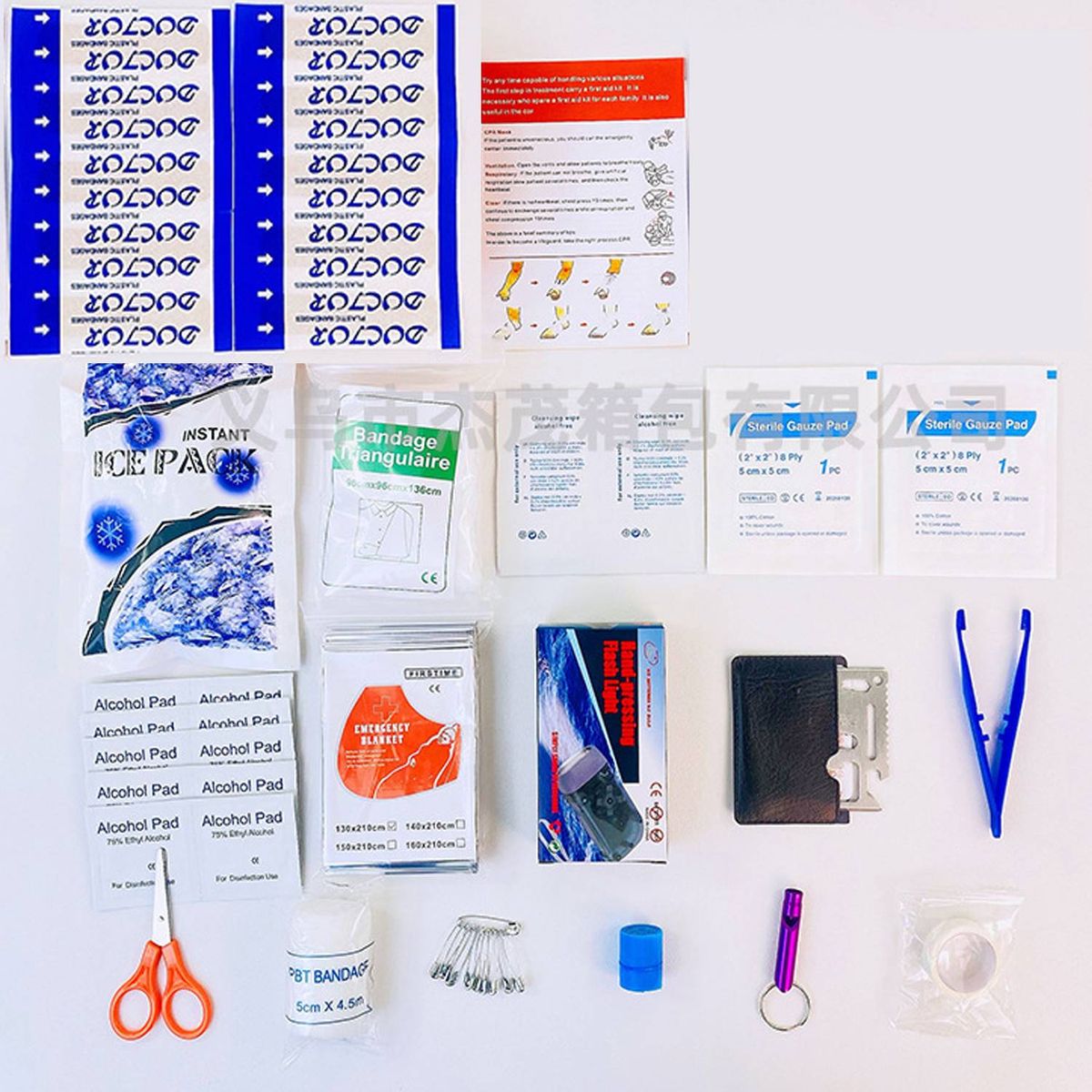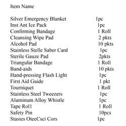 The First Aid Kit Survival Sets--Camping supplies comes with bandage adhesive strips, plastic scissors, emergency blanket, cold pack, and other multi-use items for any possible potential emergency, such as cold weather while traveling outdoors, accidental falls and sprains during sports, or accidental burns at work. The trauma first aid kit contains more than enough supply to treat a single family or a group of friends under emergency circumstances.